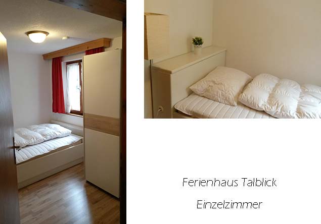 Bilder des Einzelzimmers Nr. 1 in der 1. Etage Bilder des Einzelzimmers Nr. 2 in der 1. Etage 2. Etage/Dachgeschoss: Die 2. Etage besteht aus einer separaten Ferienwohnung für 5 Personen. Wohnküche (Herd, Backofen, Kühlschrank) mit Essplatz für 4-6 Personen, 1 Doppelzimmer mit Waschbecken, 1 Doppelzimmer, 1 kleines Einzelzimmer, Dusche, sep. WC. Alle Zimmer mit leichten Dachschrägen. Von der Wohnküche und einem der Doppelzimmer Zugang zum Balkon mit sehr schönem Ausblick über das Tal. Bilder des Doppelzimmers Nr. 1 im Dachgeschoss Bilder des Doppelzimmers Nr. 2 im Dachgeschoss Bilder des Einzelzimmers im Dachgeschoss Bilder der Küche im DachgeschossKeller: Kellerraum mit Skiabstellmöglichkeit, Lagerraum/Vorratsraum. Das Haus ist auch im Sommer buchbar, Kurztermine möglich, für mehr Infos bitte hier klicken. Unser Ferienhaus Talblick ist rauchfrei! Verpflegung